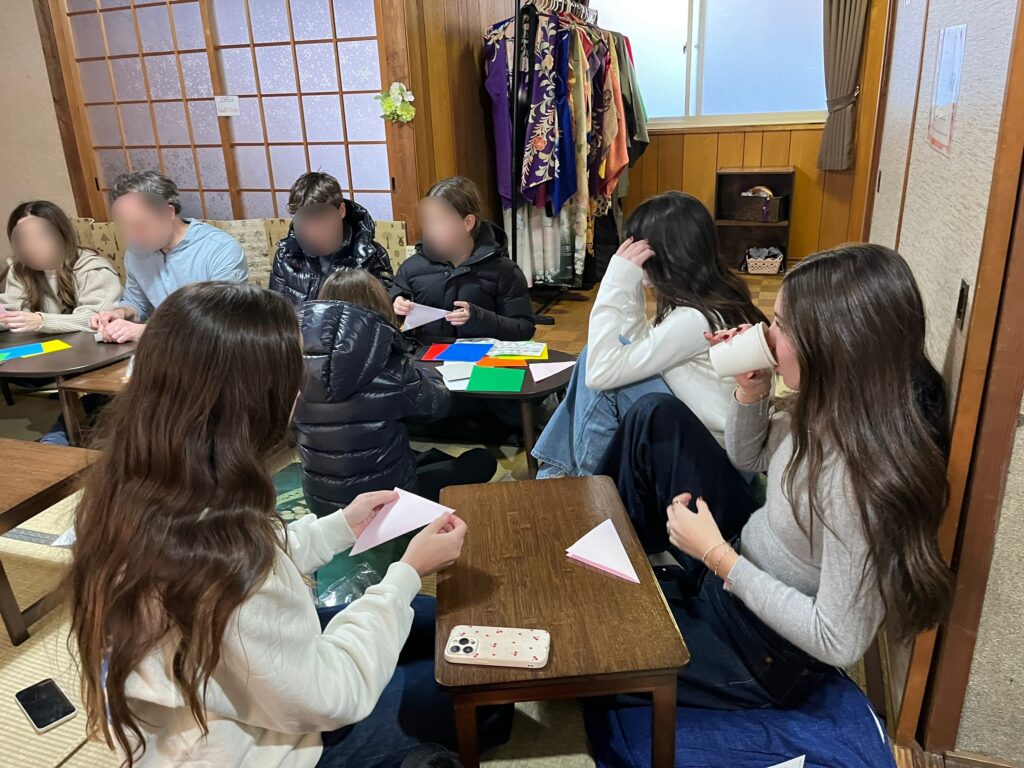 Another group visiting as two families enjoyed a hands-on origami experience, followed by traditional Japanese games such as kendama and daruma otoshi. Everyone joined in, and the space was filled with laughter and excitement.