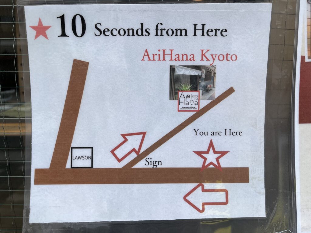 AriHana Kyoto is a hidden gem offering authentic Japanese cultural experiences in Kyoto. Finding us is part of the adventure—and once you arrive at the marked point, we are just a short walk away. Please check the map and sign and follow the directions below: