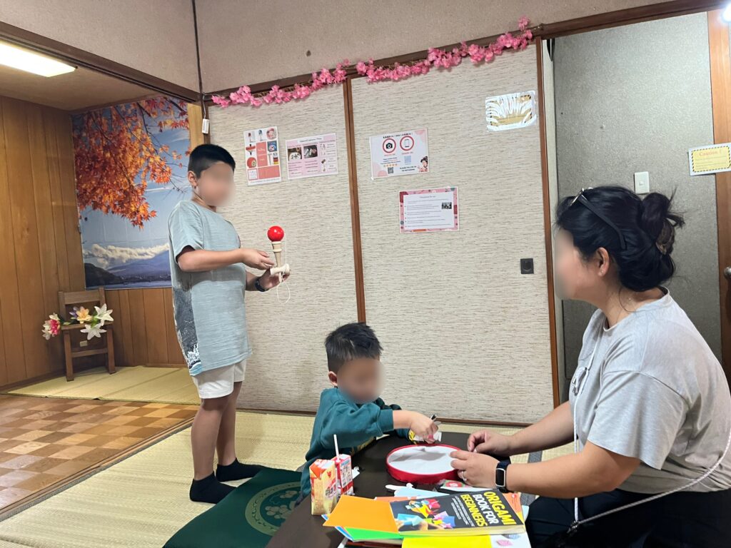 お兄ちゃんはけん玉で遊んで大喜び!何度も挑戦するうちに、すっかり上手にできるようになりました!弟は折り紙、特に鬼の形をした指人形に夢中になり、楽しそうに遊んでいました。生後8ヶ月になる可愛い赤ちゃんは、フレンドリーなスタッフに抱っこされながら、満面の笑みでした🧸💕