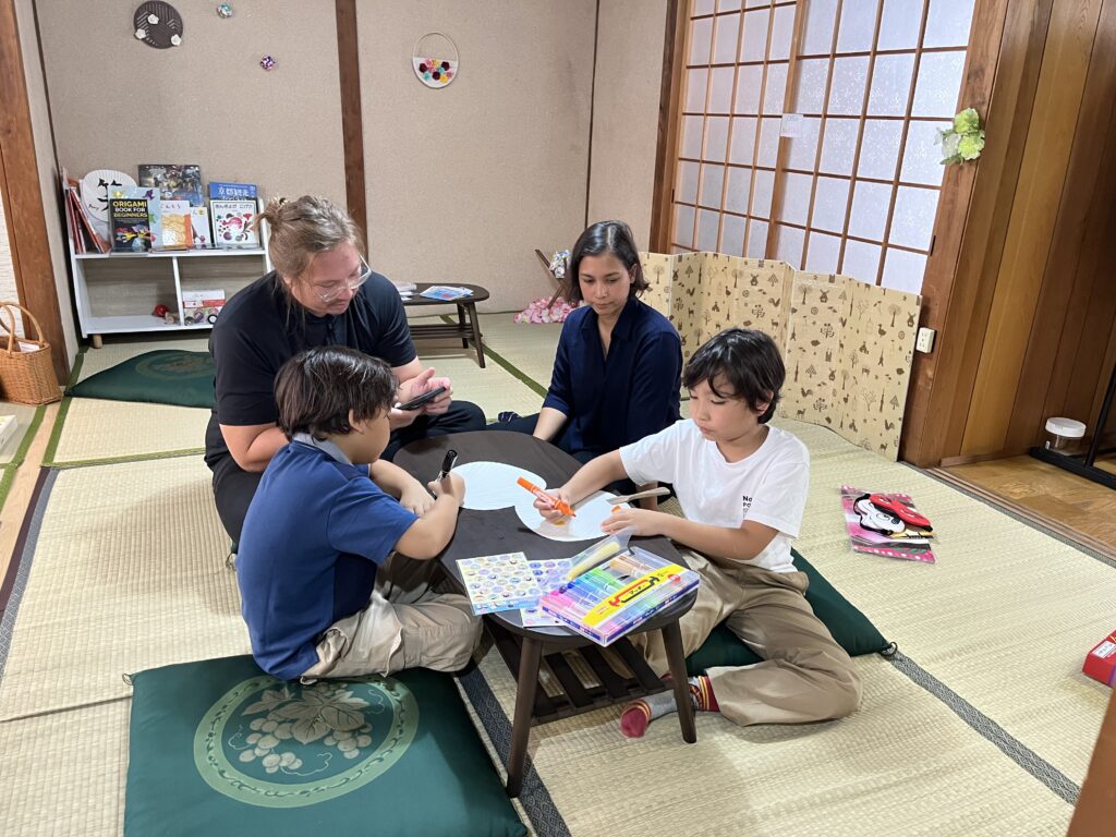 ご夫婦の2人の息子さんは好奇心旺盛で、特に手裏剣などの楽しい折り紙を楽しんでいました。ご家族全員でけん玉やだるま落としで遊び、お持ち帰り用のオリジナル団扇も作りました!